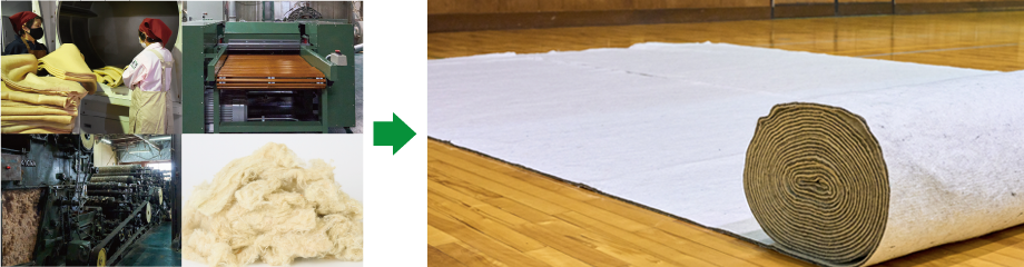 すでに実績があるのが、保存期間が終わった災害用備蓄毛布を同種の毛布へ再生、大手ガス会社の通電しない軍手を同種の軍手へ再生、アパレル会社の不要になったスーツを災害用備蓄毛布へ再生、大手飲食店のユニフォームを同種のユニフォームへ再生などです。