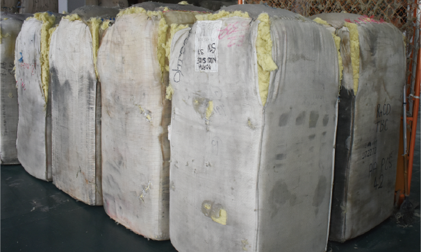 不要な毛布・軍手等を反毛綿へ。この後、反毛綿→糸→生地→再製品化